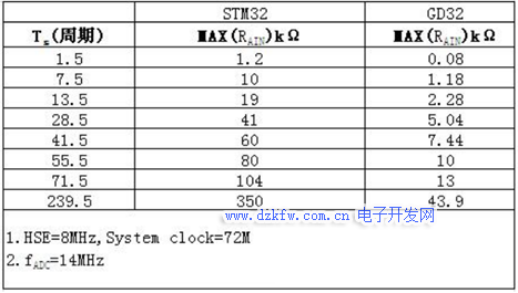 7、ADC差異GD的輸入阻抗和采樣時(shí)間的設(shè)置和ST有一定差異,相同配置GD采樣的輸入阻抗相對(duì)來說要小。具體情況見下表這是跑在72M的主頻下,ADC的采樣時(shí)鐘為14M的輸入阻抗和采樣周期的關(guān)系: