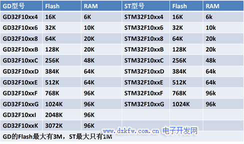 9、103系列RAM&FLASH大小差別GD103系列和ST103系列的ram和flash對(duì)比如下圖: