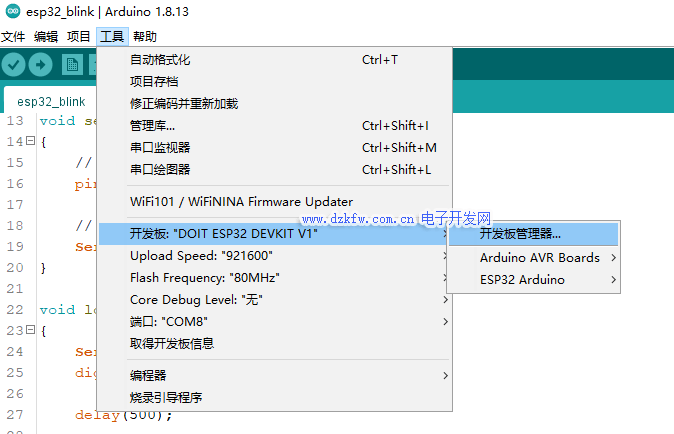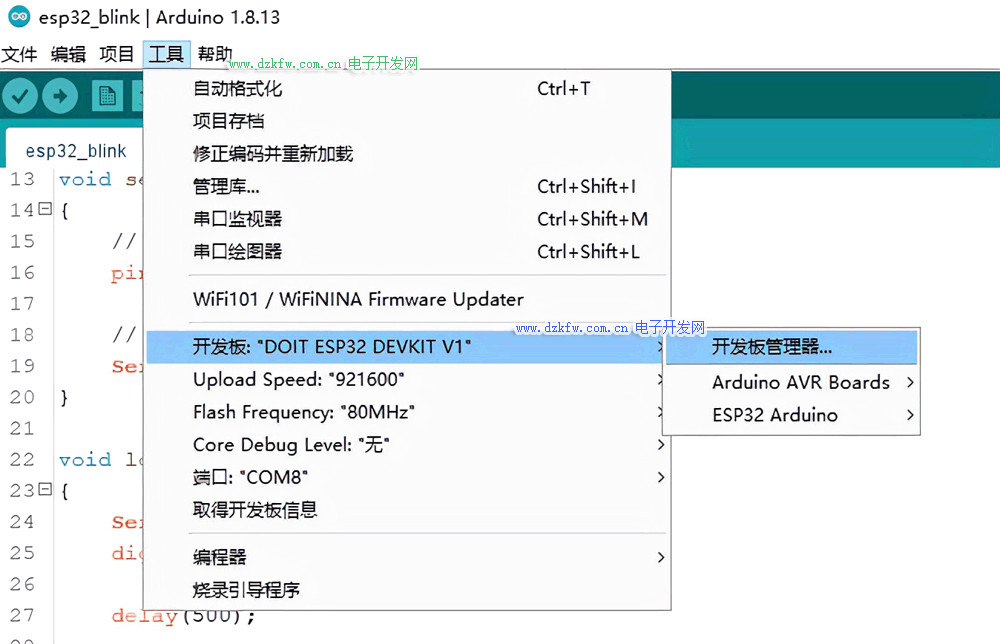 再安裝 ESP32 開發板。依次打開菜單-》工具-》開發板-》開發板管理器: