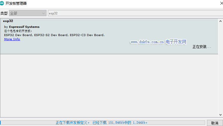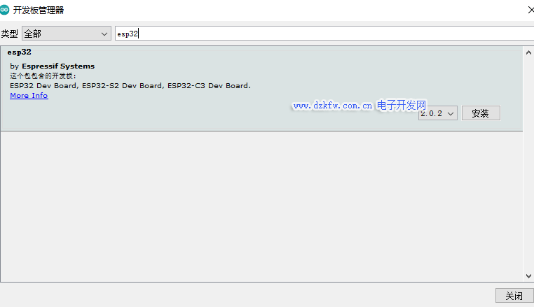 在開發板管理器中輸入 esp32 搜索出 esp32 開發板來,然后安裝之: