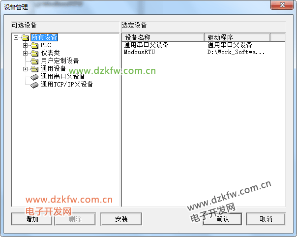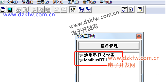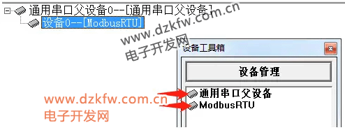 首先點擊通用串口父設(shè)備,按確定;再重復(fù)步驟,點擊ModbusRTU,就把串口和ModbusRTU都加入到設(shè)備工具欄中了。