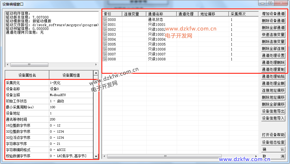 再點擊設(shè)備0--[ModbusRTU]這項,就可以看到設(shè)置參數(shù)了。左下部分可以設(shè)置讀取的相關(guān)信息,例如奇偶校驗位,采集間隔等等。右上部是設(shè)備通道,就是讀取ModbusRTU的寄存器位等信息。