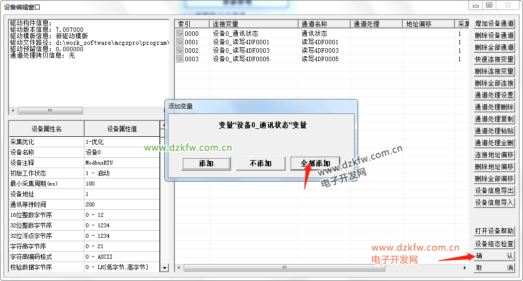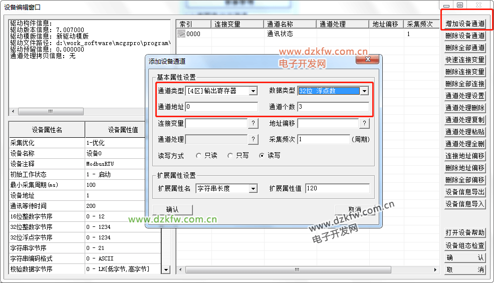 點擊增加設(shè)備通道,選擇通道類型為4區(qū)(4區(qū)是03命令,3區(qū)是04命令);數(shù)據(jù)類型浮點;通道地址從0開始;一共設(shè)置3個通道。點擊確認。