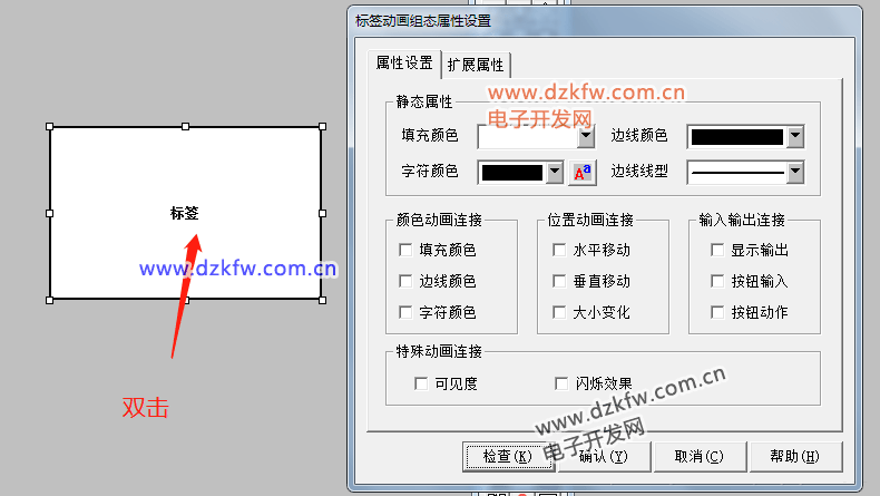 以標(biāo)簽為例,雙擊打開屬性。可以看到可以設(shè)置字體的背景、顏色、大小,動作等。