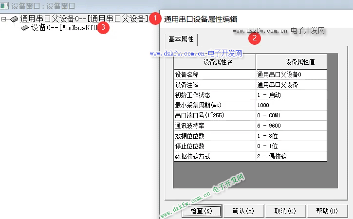 (2)鼠標雙擊①處的通用父設備進行基本屬性設定,根據V20 CN011連接宏后,通信參數如圖4中的②處所示,確定無誤后點擊“確認按鈕”。需要注意串口端口號需要與實際一致。