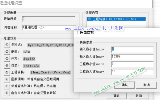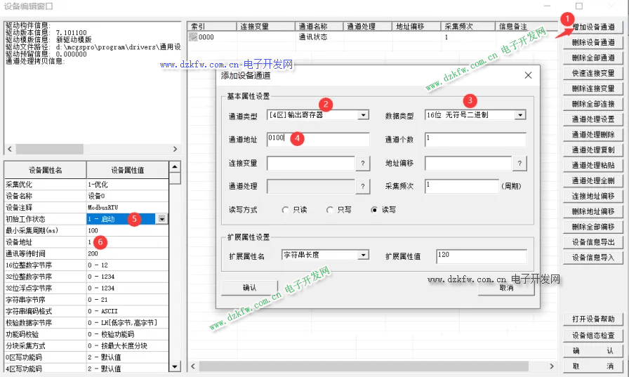 (4)繼續添加頻率設定設備通道地址40101,操作方法如圖8所示。但需要注意的是,頻率0-50HZ對應十進制數0-16384的值,因此需要做數據處理,點擊圖8中的⑥處進行轉換。其他地址操作方法相同,不再贅述。