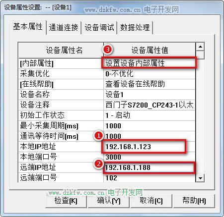 2、在設備屬性設置中,將計算機的 IP 地址填入【本地 IP 地址】,模塊的 IP 地址填入【遠端 IP地址】,【遠端端口號】填入 102;PPI轉以太網通訊