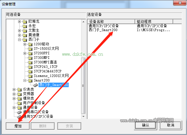 第八步:(鼠標選中西門子Smart200,點擊新增,右側選定設備就會自動添加進去。)