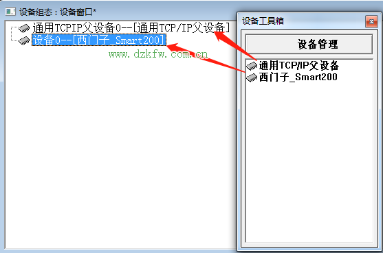 第九步:(設備工具箱—設備管理—鼠標依次點擊通用TCP/IP父設備—西門子_ Smart200到設備窗口里面去)。
