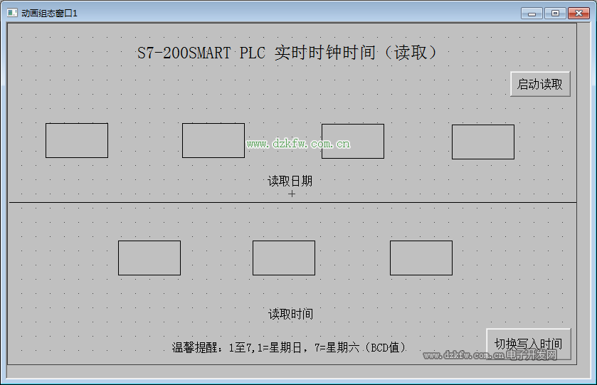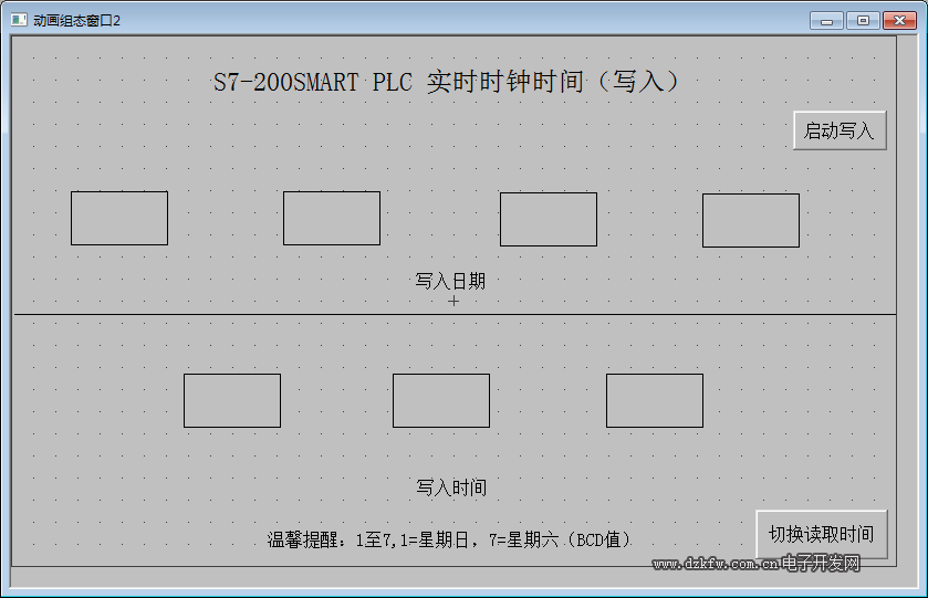 第三步:(雙擊打開窗口1,設計如下圖S7-200SMART PLC 實時時鐘時間(寫入)畫面)。寫入畫面設計與讀取設計是基本是一致的,大家可以參考讀取來以此類推。