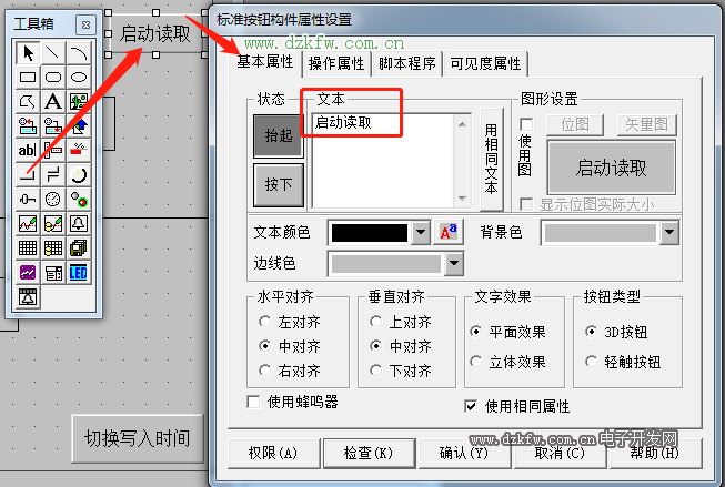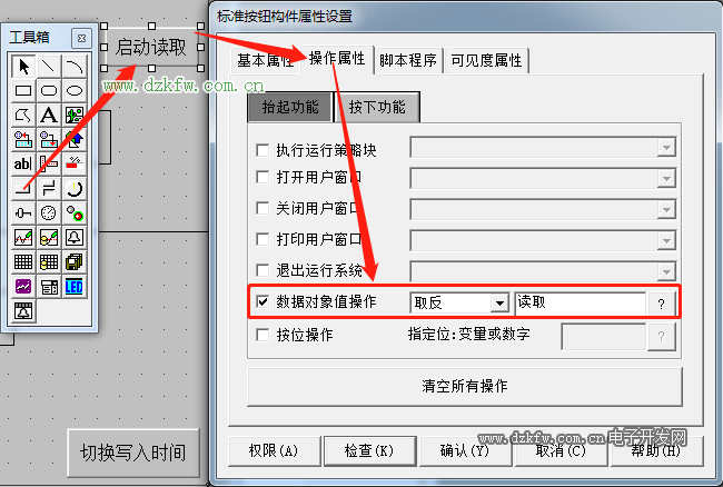 3. 使用標準按鈕設置啟動時鐘讀取按鈕,在基本屬性文本寫入啟動讀取,操作屬性—勾選數據對象值操作—取反,點擊問號關聯PLC變量地址。
