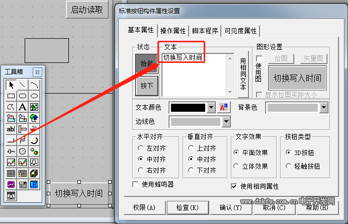 4. 使用標準按鈕設置切換寫入時鐘畫面,在基本屬性文本寫入切換寫入時間,操作屬性—勾選打開用戶窗口選擇窗口2。