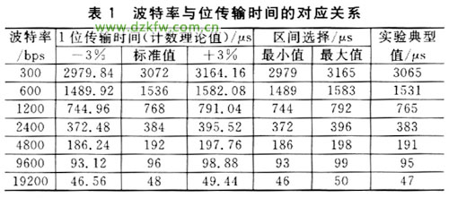 假如數據傳送的格式是7位,加上校驗位、1個起始位以及1個停止位,共10個數據位,而數據傳送的速率是960字符/秒,則傳送的波特率為 10×960=9600bps 波特率的倒數為每一位的傳送時間,即 T=1/9600≈0.104ms 由上述的異步通信原理可知,相互通信的A、B站點雙方必須具有相同的波特率,否則就無法實現通信。