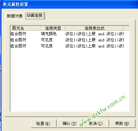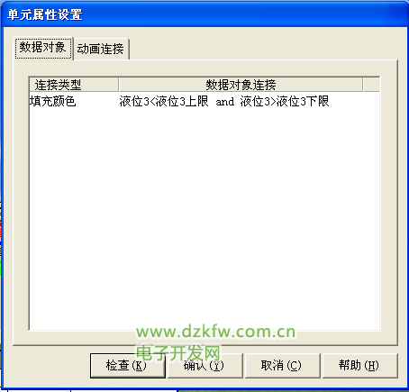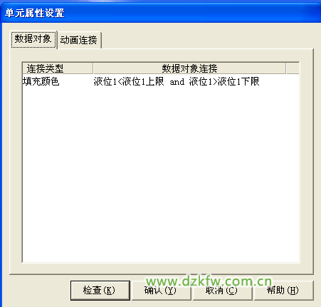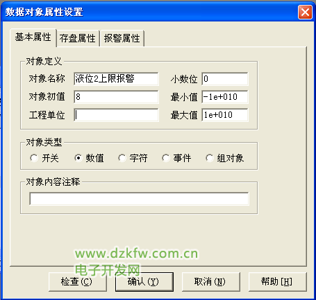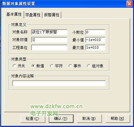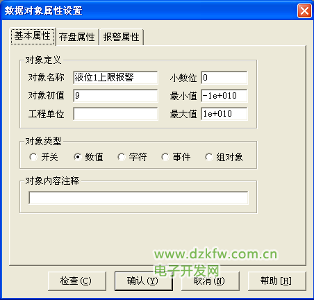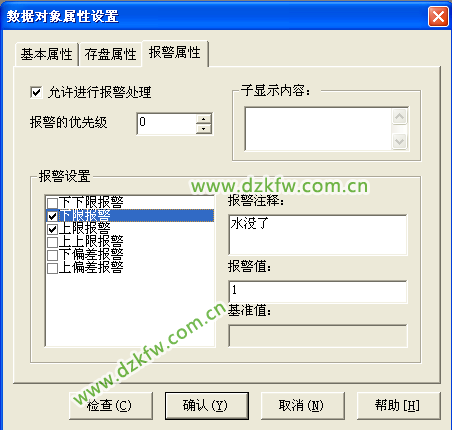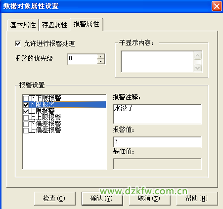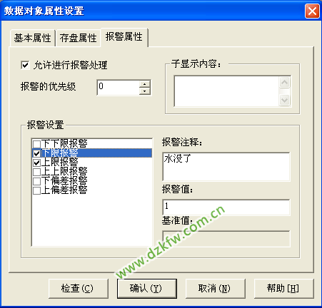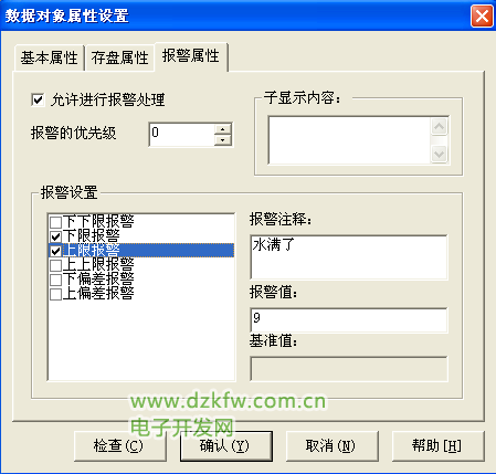 以循環水控制系統中的“液位1”數據對象為例進行講解定義數據對象報警信息的過程;在實時數據庫中雙擊“液位1” 數據對象,在報警屬性中選中“允許進行報警處理”;在報警設置中選中“上限報警”,把報警值設為 9 米;報警注釋為  水滿了;在報警設置中選中“下限報警”,把報警值設為 1米;報警注釋為  水沒了,如圖4-2所示。在存盤屬性中,選中“自動保存產生的報警信”,確認后完成數據對象的屬性設置,如圖4-3所 示。