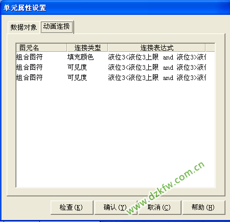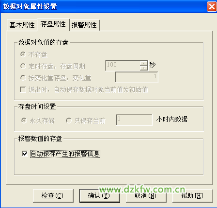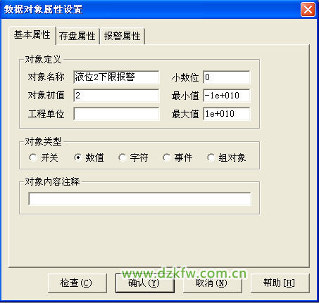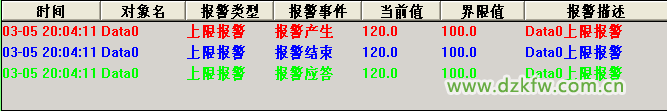 數值型數據對象有六種報警 下下限、下限、上限、上上限、上偏差、下偏差。開關型數據對象有四種報警方式 開關暈報警、開關暈跳變報警、開關暈正跳變報警和開關暈負跳變報警,開關暈報警時可以選擇是開報警或者關報警,當一種狀態為報警狀態時,另一種狀態就為正常狀態。用戶在使用時可以根據不同的需要選擇一種或多種報警方式。事件型數據對象不進行報警限值或狀態設置,當對應的事件產生時報警也就產生,對事件型數據對象報警的產生和結束是同時完成的。字符型數據對象和組對象不能設置報警屬性,但對組對象而言所包含的成員可以單個設置報警。組對象一般可用來對報警進行分類管理,以方便系統其他部分對同類報警進行處理。當報警信息產生時可以設置報警信息是否需要自動存盤,這種設置操作需要在數據對象的存盤屬性中完成。