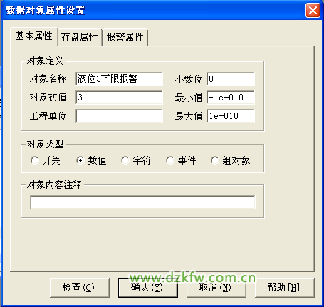 圖4-12 液位3上限報警和 液位3下限報警的數據對象屬性設置
