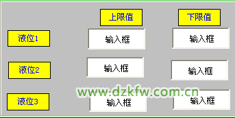 在“用戶窗口”選“循環水控制”窗口進入,在“工具箱”選“標簽” 圖標用千文字注釋,分別在適當的位置寫入“上限值”、“上限值”、“液位1”、“液位2”、“液位3”。選中工具箱當中的“輸入框” 圖標,用千在運行時輸入上下限值,如圖4-13所示。