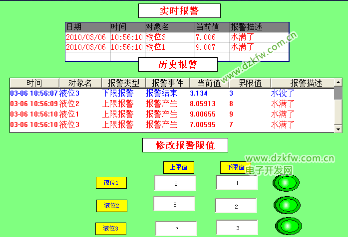 打開工作臺的“實時數據庫”,對“液位1”、“液位2”、“液位3”的上下限報警值都定義好了,如果想在運行環境下根據實際情況隨時需要改變報警上下限值,如何實現呢?在MCGS嵌入式組態軟件中,為用戶提供了大暈的函數,可以根據用戶的需要靈活地進行設置。具體操作如下