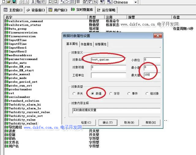 1、在實時數據庫中新建一個模擬變量,名稱為“test_quxian”,設定該變量的最小值為0,最大值為100。