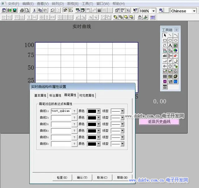 4、在實時曲線畫面中添加實時曲線控件,在曲線控件中添加“test_quxian”變量。另外需要配置相應的曲線控件屬性,由于比較簡單,不再贅述。