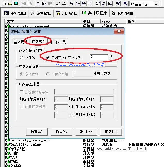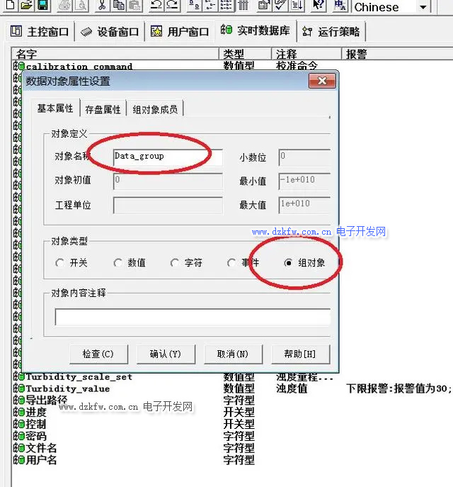 1、在實時數據庫中新建一個組對象,在存盤屬性中設置存盤周期為5秒,把需要在歷史曲線中顯示的變量添加到組對象成員列表中。