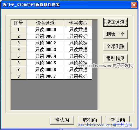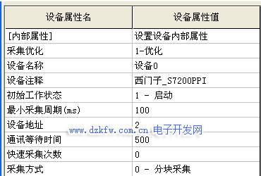 03設(shè)備構(gòu)件的連接實例西門子S7-200以進(jìn)行設(shè)備連接完成后,可以對其進(jìn)行通信協(xié)議的設(shè)置 了,雙擊“西門子S7-200PPI”進(jìn)入設(shè)備編輯窗口,檢查驅(qū)動構(gòu)件信息是否正確。點擊圖標(biāo)在進(jìn)入設(shè)備屬性值的內(nèi)部屬性進(jìn)行操作,彈出“西門子S7-200PPI”通道屬性設(shè)置窗口。如圖8-15所示。以PLC的位操作變暈為例進(jìn)行添加來舉例操作如下 點擊全部刪除按鈕把系統(tǒng)默認(rèn)的位變暈刪除,然后進(jìn)行添加設(shè)備通道,彈出添加設(shè)備通道對話框。寄存器類型選 擇M或者V寄存器作為輸入寄存器,默認(rèn)的I寄存器無法使用所以全部刪 除。寄存器地址選擇0地址,數(shù)據(jù)類型選擇0位通道數(shù)暈為1,操作方式選擇讀寫方式,確定完成添加通道的操作,如圖8-16所示。