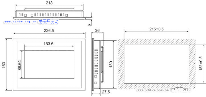 3. TPC7062型MCGS觸摸屏的外觀尺寸如圖8-9所示(單位 mm)。在工廠實際現(xiàn)場安裝時按照實際的開孔尺寸進(jìn)行安裝。