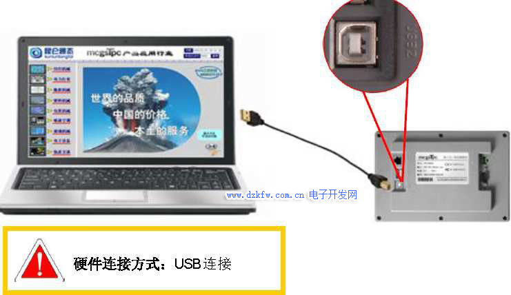 6. TPC7062型MCGS觸摸屏與計算機(jī)連接方式 MCGS觸摸屏反面有兩個USB接口, USB2接口是用來與計算機(jī)進(jìn)行數(shù)據(jù)通信用的, USB1接口是用來備份MCGS觸摸屏的實時數(shù)據(jù)庫的數(shù)據(jù)的。MCGS觸摸屏與計算機(jī)連接示意圖如圖8-12所示。
