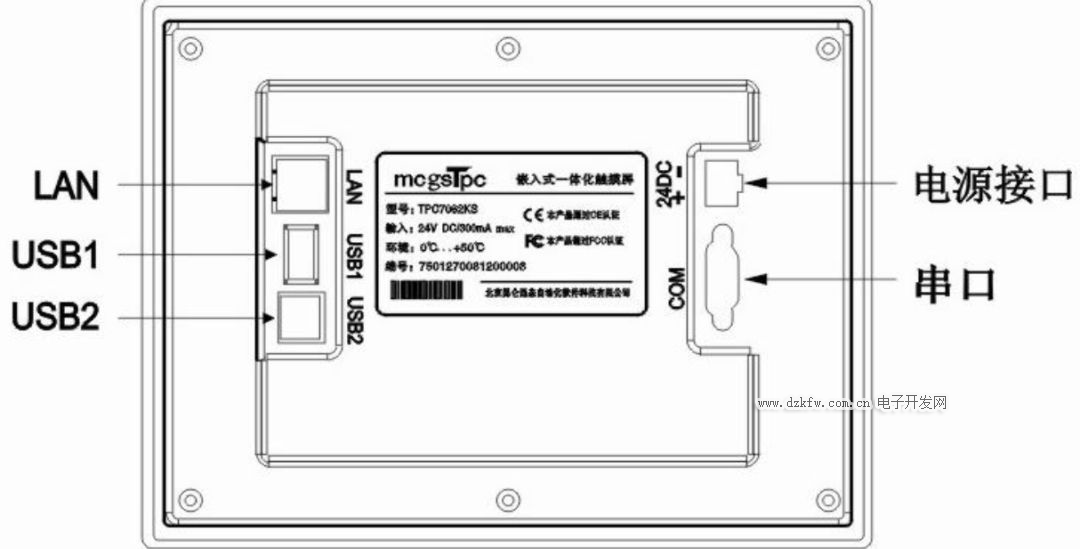 1. TPC7062型MCGS觸摸屏的屏幕尺寸為7寸的觸摸屏,TPC7062型MCGS觸摸屏的產(chǎn)品外觀參考如圖8-7所示。