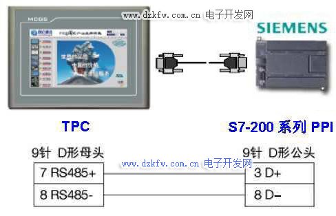 通信連接方式 西門子S7—200系列PLC都可以通過CPU單元上的編程通信口(PPI端口)與TPC觸摸屏連接,其中CPU224有兩個通信端口,都可以用來連接觸摸屏,但需要分別設(shè)定通信參數(shù)。通過CPU直接時需要注意軟件中通信參數(shù)的設(shè)定。西門子S7—200系列PLC與TPC7062型MCGS觸摸屏的連接方式圖如圖8-19所示。