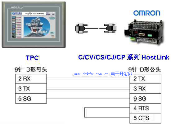3. 歐姆龍系列PLC的RS232擴(kuò)展串口與TPC7062型MCGS觸摸屏連接方式如圖8-20所示。