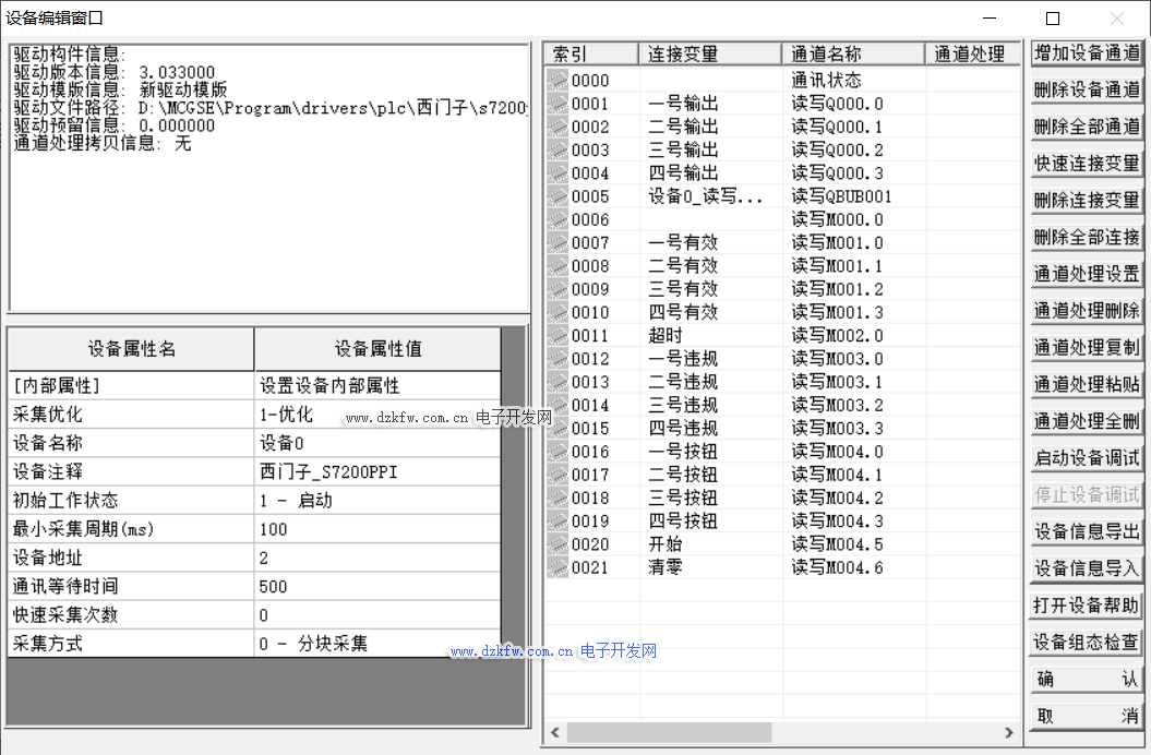 設備的編輯窗口需要創建與PLC程序對應的通道,然后對變量進行一一的連接。