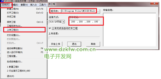 連接網線后,打開軟件,步驟如下,文件-上傳工程-TCP/IP網絡連接-設置IP,如圖操作