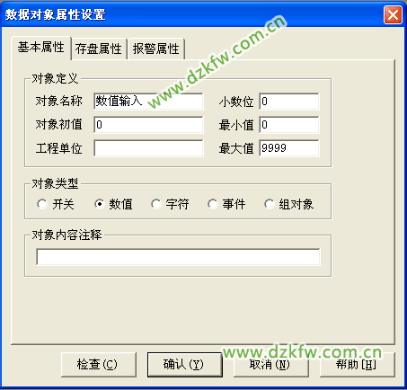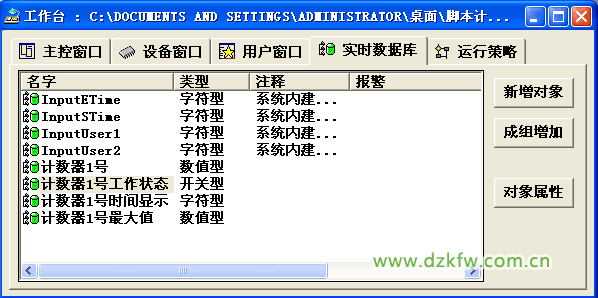 開關型、數值型、字符型三種數據對象分別對應千腳本程序中的三種數據類型。在腳本程序中不能對組對象和事件型數據對象進行讀寫操作, 但可以對組對象進行存盤處理。