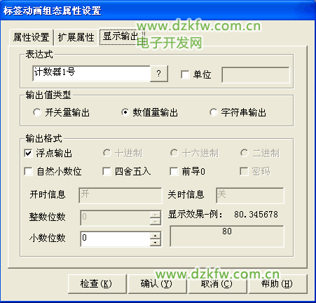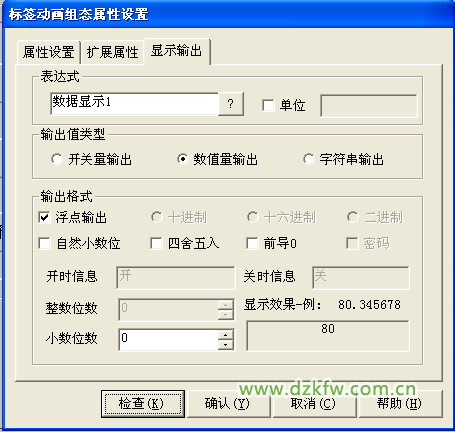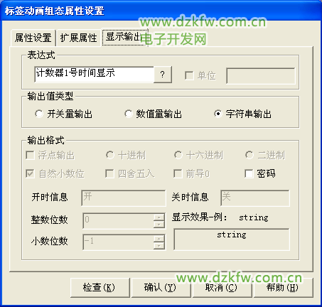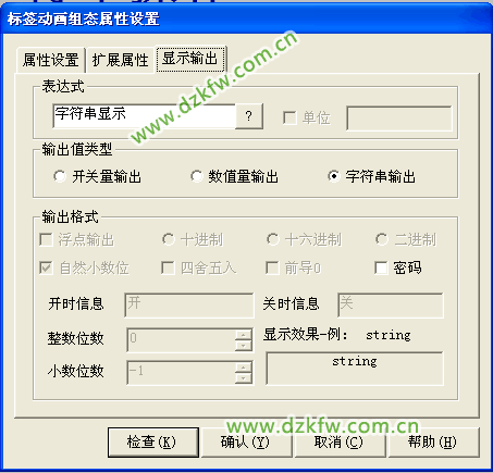 在MCGS組態軟件開發平臺上,單擊“實時數據庫”,點擊“新增對象”按鈕,新增10個變暈 數據顯示1、數據顯示2、數據顯示3、數據顯示4、數值輸入、為數值型的,字符串分解1、字符串分解2、字符串分解3、字符串分解4、字符串顯示為字符串型的。窗口屬性設置如下,其中 字符串分解2、字符串分解3、字符串分解4屬性設置只需要把“顯示輸出”中“表達式”中的“字符串分解1”改為“字符串分解2”、“字符串分解3”、“字符串分解4”;其中數據顯示2、數據顯示3、數據顯示4屬性設置只需要把“顯示輸出”中“表達式”中的“數據顯示1” 相應地改為 “數據顯示2”、“數據顯示3”、“數據顯示4”即可。分別以代表性變暈為例參照設置,如圖12-14所示。