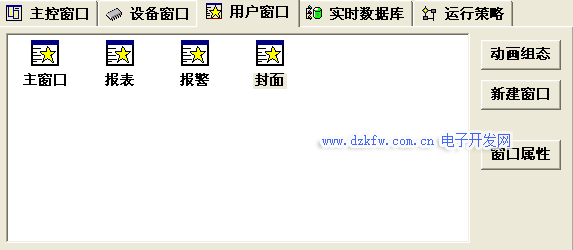 2建立新畫面·雙擊“MCGS組態環境”圖標,進入MCGS嵌入版組態軟件環境工作臺。在MCGS組態工作臺上,單擊“用戶窗口”,在“用戶窗口”中單擊“新建窗口”按鈕,則產生新“窗口0”,選中“窗口0”,單擊右邊的窗口屬性按鈕,并將窗口名改為“主窗口”。 同理建立“報表”,“報警”,“封面”窗口,整體框圖如圖實訓4-1至圖實訓4-4所示。
