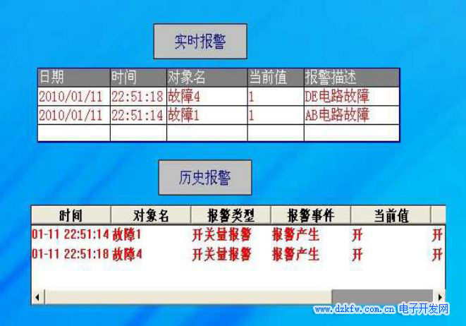 ·歷史報警使用報警瀏覽按鈕制作的,報警瀏覽按鈕從“工具箱”中單擊圖 標,變“十”后用鼠標拖動到適當位置大小。在“報警顯示構件屬性設置” 中,把“對應的數據對象的名稱”改為:“故障”,按“確認”后,則歷史報警設置完畢。在運行環境中單擊“報警”菜單,打開“報警窗口”可以查看實時報警和歷史報警的相關信息。