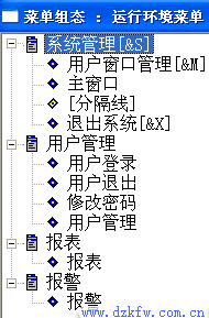 8主菜單建立·系統工程的主菜單建立如下:雙擊打開“主控窗口”新增3個操作集,分別命名為“用戶管理”、“報表”、“報警”。在“用戶管理”下新增4個操作,分別命名為“用戶登錄”、“用戶退出”、“修改密碼”、“用戶管理”。然后分別對它們的菜單屬性進行設 置,在“主控窗口”的屬性設置 “菜單設置”設為”有菜單”,供電監控系統工程的主菜單完成如圖4-9所示。