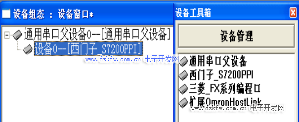 ·設備窗口是MCGS組態系統的重要組成部分,在設備窗口中建立系統與外部硬件設備的鏈接關系。使系統工程能夠從外部設備讀取數據并控制外部設備的工作狀態,實現對監控過程的實時監控。設備窗口是連接和驅動外部設備的工作環境。MCGS嵌入版組態軟件提供了多種類型的“設備構件”,作為系統與外部設備進行聯系的媒介。進入設備窗口從設備構件工具箱里選擇相應的構件,建立接口與通道的連接關系,設置相關的屬性即完成了設備窗口的組態工作。運行時應用系統自動裝載設備窗口及其含有的設備構件,并在后臺獨立運行設備窗口是不可見的,如圖4-10所示。
