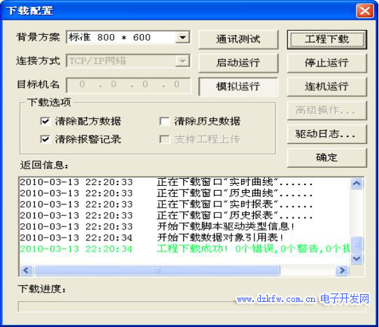·點擊下載配置中的“停止運行”按鈕,或者模擬運行環境窗口中的停止按鈕,工程停止運行;點擊模擬運行環境窗口中的關閉按鈕使窗口關閉。下載過程圖如圖4-11所示。