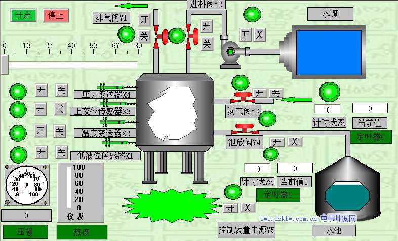 ·監控主窗口設計:在MCGS組態平臺上單擊“用戶窗口”,在“用戶窗口”中單擊“新建窗口”按鈕,則產生新“窗口0” 選中“窗口0”,單擊“窗口屬性”,進入“用戶窗口屬性設置”將“窗口名 稱”改為:控制裝置;將“窗口標題”改為:控制裝置;在“窗 口位置”中選中“最大化顯示”,其他不變,單擊“確認”。選中“控制裝置”,單擊“動畫組態”,進入動畫制作窗口。在該窗口中添加一個水罐、一個水池、一個液位灌、一個水泵、一個滑動輸入器、一個進料閥Y2、一個排氣閥Y1、一個泄放閥Y4、一個氮氣閥Y3、一個控制電源Y5、四個傳感器,一個壓強計、一個熱度計、二個定時器、一個開啟按鈕SB1和一個停止按鈕SB2。用10個指示燈和開關分別控制進料閥、排氣閥、泄放閥、氮氣閥、四個傳感器、水泵和控制裝置電源,2個指示燈分別控制2個定時器。在工具箱中分別選擇流動塊構件,當鼠標變為“十”拖動鼠標到適當大小,用流動塊連接各個器件完成的監控主窗口如圖實訓5-2所示。