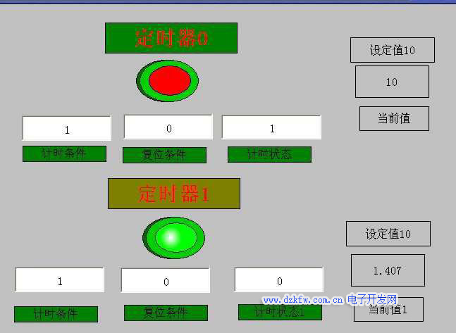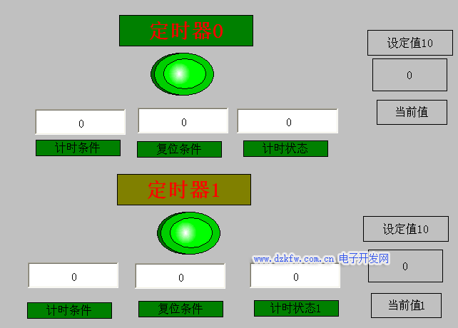 ·定時器設置是當計時條件等于1時,開始計時。當前值等于設定值等于10,計時狀態為1,定時器0燈亮。復位條件等于1時燈滅,并重新定時。同樣的屬性設置  定時器1。定時器0計時狀態為1,指示燈亮,定時器1計時狀態1為1,指示燈亮。顯示效果圖如圖實訓5-33所示。