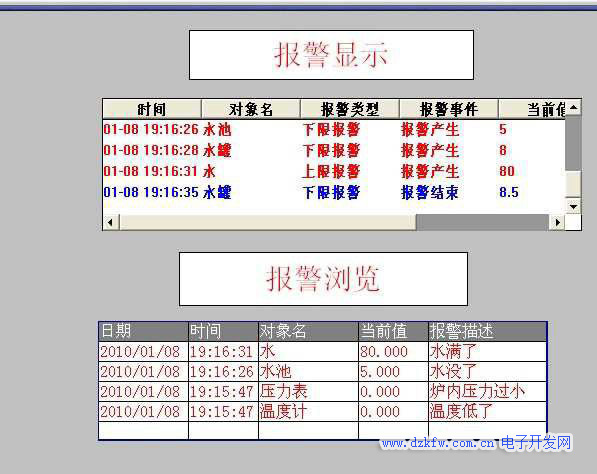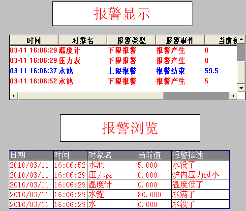 警值為100,報警注釋溫度高了。水的上限報警值為80,報警注釋水滿了。溫度計的下限報警值為10,報警注釋溫度低了。水池的上限報警值為60,報警注釋水滿了。壓力表的上限報警值為98,報警注釋爐內壓力過大。水池的下限報警值為5,報警注釋水沒了。壓力表的下 限報警值為5,報警注釋爐內壓力過小。水灌的上限報警值為70,報 警注釋水滿了。水灌的下限報警值為8,報警注釋水沒了。報警顯示 效果圖如圖實訓5-32所示。