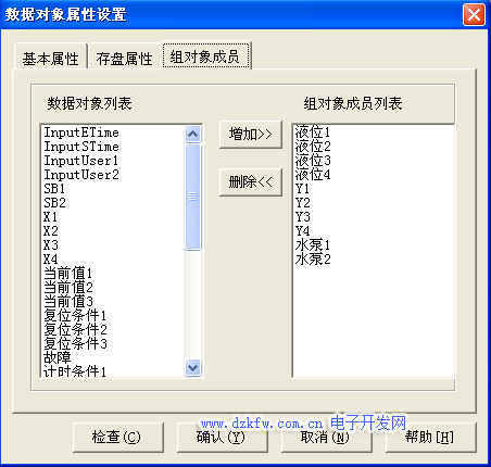 ·數據對象的建立以液位組變量的屬性設置為例進行講解;進入組對象的基本屬   性,將對象名稱為:液位組;對象類型為:組對象;其他屬性設置不變。在組變 量的存盤屬性中,數據對象值的存盤選中定時存盤,存盤周期設為5秒。在組對  象成員中選擇所需添加的組變量成員。具體設置如圖實訓5-9至圖實訓5-11所示。
