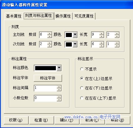中 “滑塊指向”選中“指向左(上)”。“刻度與標注屬性”把“主劃線數目”改為6,其他屬性設置不變。如圖實訓5-12至圖實訓5-13所示。