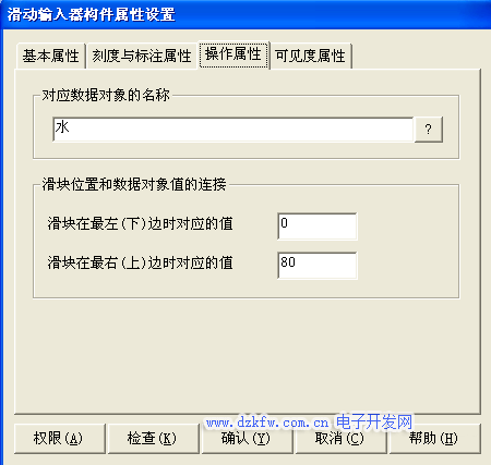 ·(1)滑動輸入器的屬性設置:在“工具箱”中選中滑動輸入器圖標,當鼠標變為“十”后拖動鼠標到適當大小。在“滑動輸入器構件屬性設置”的“操作屬性”中,把對應數據對象的名稱改為水,可以通過單擊圖標,到庫中選或者自己輸入也可以;“滑塊在最右邊時對應的值”為80。在 “滑動輸入器基本屬性”