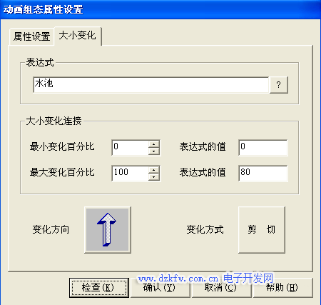 ·(3)水罐、水池的液位變量的屬性設置;打開動畫組態屬性設置窗口連接相應 的變量,將最大變化百分比100,對應的表達式的值為80,其他屬性不變。水罐液位變量的屬性設置參照如圖實訓5-12  所示進行設置。而水池中最大變化百分比100,對應的表達式的值該為80即可。水池液位變量的屬性設置參照如圖實訓5-14所示進行設置。