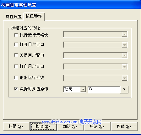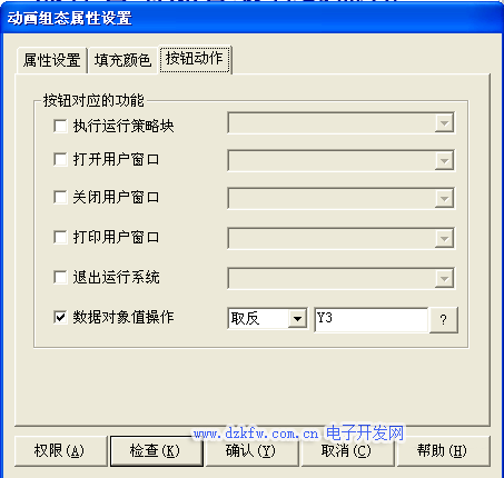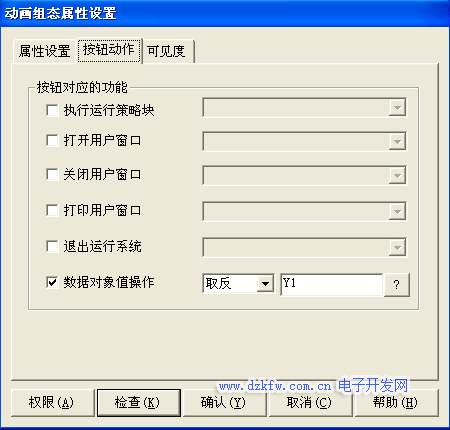 (4)開關型構件的屬性設置:在用戶窗口中雙擊自動窗口進入,選 中排氣閥Y1變量雙擊,則彈出單元屬性設置窗口。選中組合圖符單擊 則進入動畫組態屬性設置,按圖實訓5-15所示設置。其他的開關型變量的屬性設置如進料閥Y2變量、氮氣閥Y3變量、泄放閥Y4變量、控 制裝置電源Y5變量跟排氣閥Y1變量屬性設置相同,如圖實訓5-16、5-17所示。