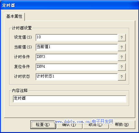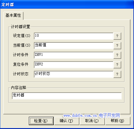 ·定時器的屬性設置:雙擊“定時器”進行基本屬性設置,連接相應的變量進行如下屬性設置。循環策略中有2個定時器,2個定時器設定值都改為10即可。其他的 定時器屬性設置參考圖實訓5-20所示進行相應的屬性設置。
