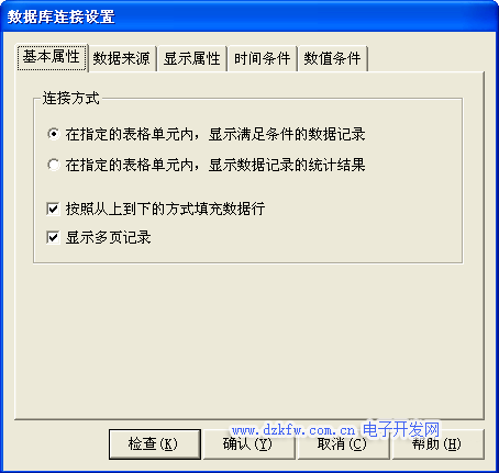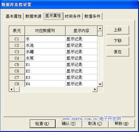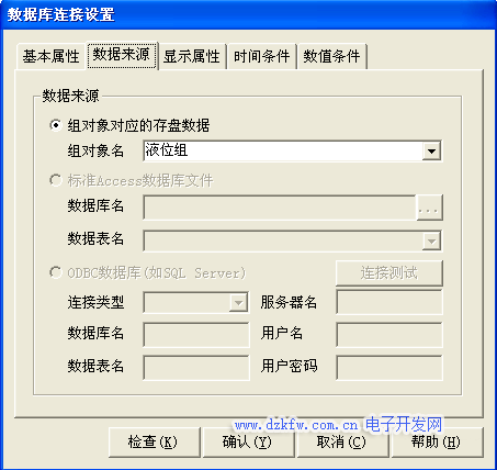 ·進入“數據庫連接”窗口并且單擊“基本屬性”中的“存盤數據源組態設  置”,彈出“數據源配置”,基本屬性中設置“顯示多頁記錄”數據來源“液位組”,顯示設置為各變量。具體屬性設置如圖實訓5-26所示。按F5 或直接按下載運行圖標,進入運行環境如圖實訓5-27所示。